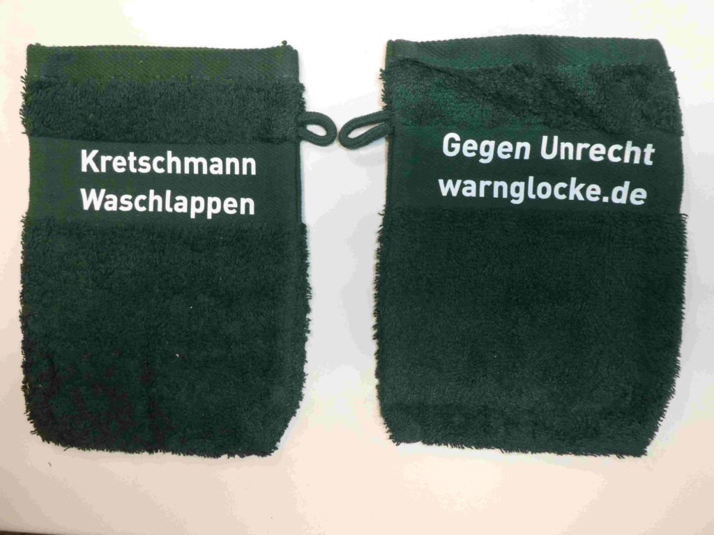 Dies wiederum ist ein guter Grund exemplarisch „Kretschmann Waschlappen als Weihnachtsgeschenk Idee anzubieten. Dies wie folgt: Sie senden per Brief an die „Bürgerinitiative Prozessbeobachter, Kappel 18, 88263 Horgenzell oder Überweisung auf das Konto DE 42 100 100 1006 3930 3128 mit Adressennennung 20,00 €. Dafür erhalten Sie porto- und verpackungskostenfrei sofort 2 Kretschmann Waschlappen als Sammlerstücke. Der übrige Geldbetrag geht an die Arbeit der Bürgerinitiative Prozessbeobachter.
